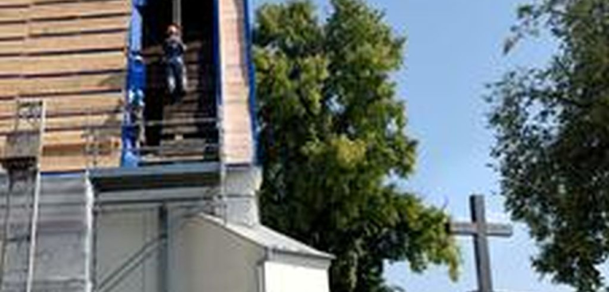 Na placu obok kościoła, zgromadzono materiały do remontu. Wrażenie robią potężne bale i belki wiązarowe. Na dachu od strony południowej (od rzeki Kamiennej )pracują, zabezpieczeni linami specjaliści z Nowosądecczyzny, wymieniają belki, całą konstrukcję dachową i spróchniałe deski powały kościoła. Później przejdą na stronę północną. Po wymianie belek, więźby dachowej, przyjedzie kolejny zespól, który położy blachę.