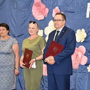 Starosta M. Dębniak wręczyła również podziękowania za pracę dyrekcjom i nauczycielom ? opiekunom dydaktycznym laureatów: dyrektorowi Dariuszowi Kaszubie i nauczycielowi Monice Żardeckiej z I LO im. S. Staszica, wicedyrektorowi, Piotrowi Pobiega oraz nauczycielom: Dorocie Drzazga i Wojciechowi Studzieżbie z II LO im. J. Chreptowicza, dyrektorowi Robertowi Wardzie oraz nauczycielom: Dorocie Kamińskiej, Barbarze Cecot i Arturowi Tofilowi z III LO im. W. Broniewskiego, dyrektor Annie Trojanowskiej i trenerom Szymonowi Kurasińskiemu oraz Mariuszowi Staweckiemu z ZSO Mistrzostwa Sportowego, dyrektorowi Tomaszowi Łodejowi i  nauczycielowi, Katarzynie Pastuszce z ZS Nr 3 oraz dyrektor Niepublicznego  Liceum S. Konarskiego, Kindze Wnuk i nauczycielowi Piotrowi Kiljańskiemu.