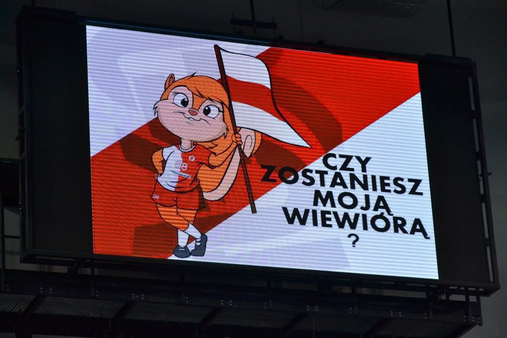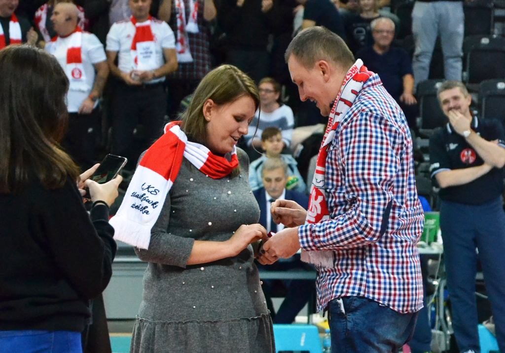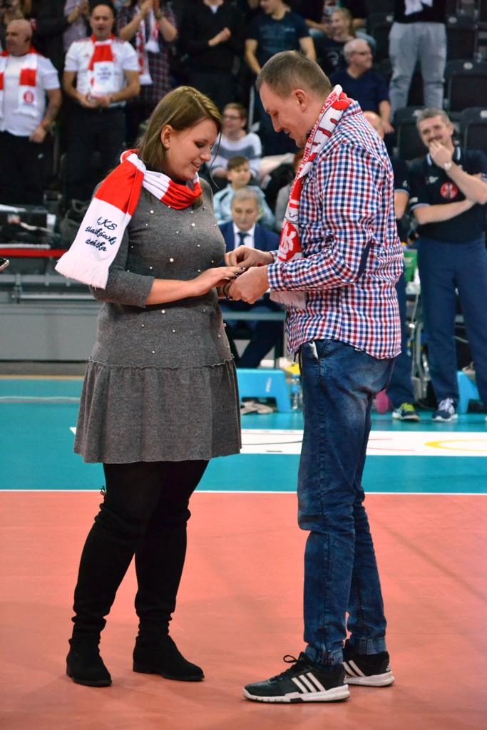 Gdy na tablicy pojawiło się pytanie "Czy zostaniesz moją Wiewiórą?" nie tylko Piotr czekał na odpowiedź. Czekało niespełna 2000 osób zgromadzonych w Sport Arenie. Tak wyglądały oświadczyny na meczu ŁKS Commercecon z BKS-em Bielsko-Biała.